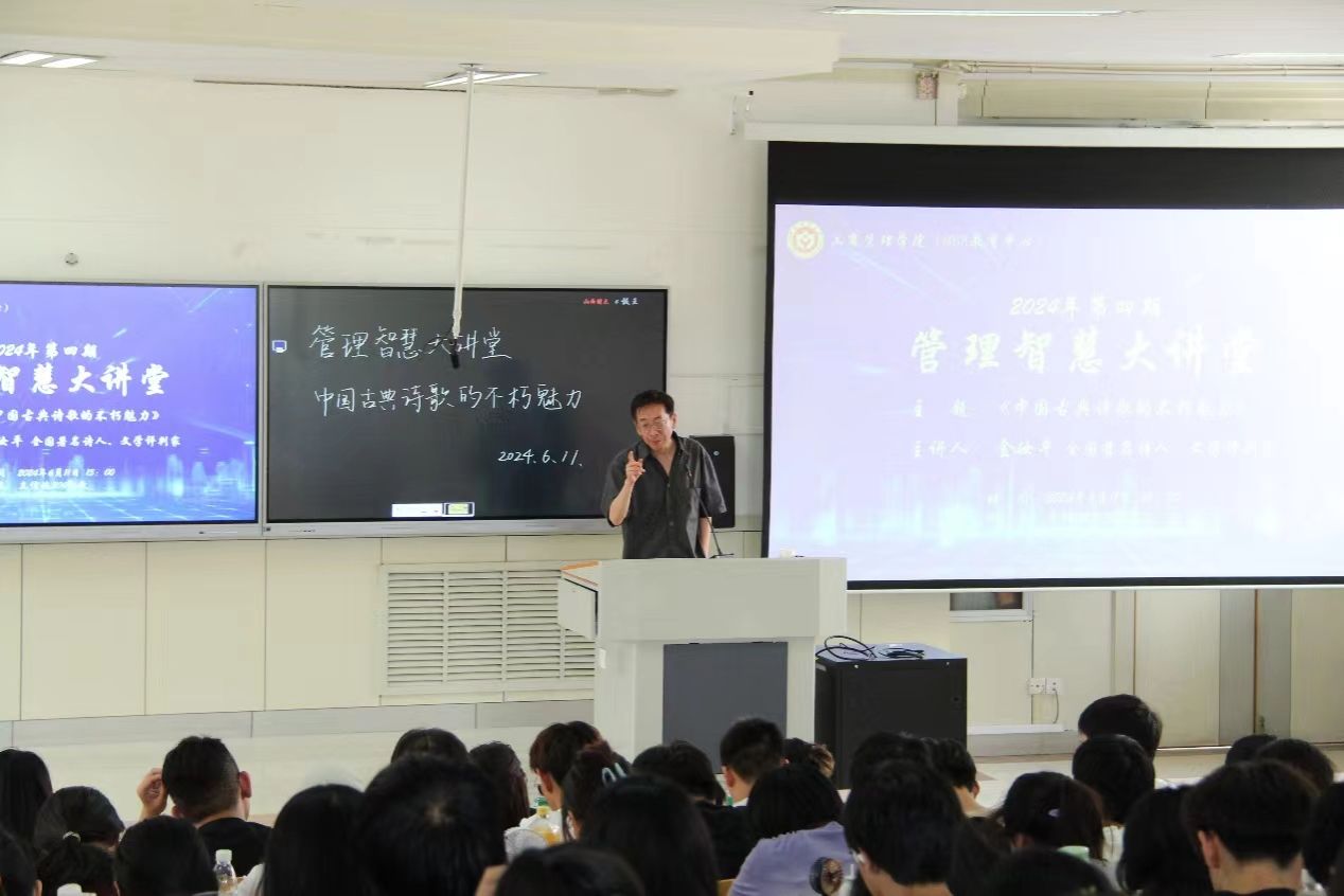 6月11下午,我院在立信楼304阶梯教室举办2024年第四期“管理智慧大讲堂”。本次活动特邀全国著名诗人、文学批评家金汝平先生作了题为“中国古典诗歌的不朽魅力”的专题讲座。学院2022级全体本科生及辅导员参加。学院党委副书记周志刚主持。