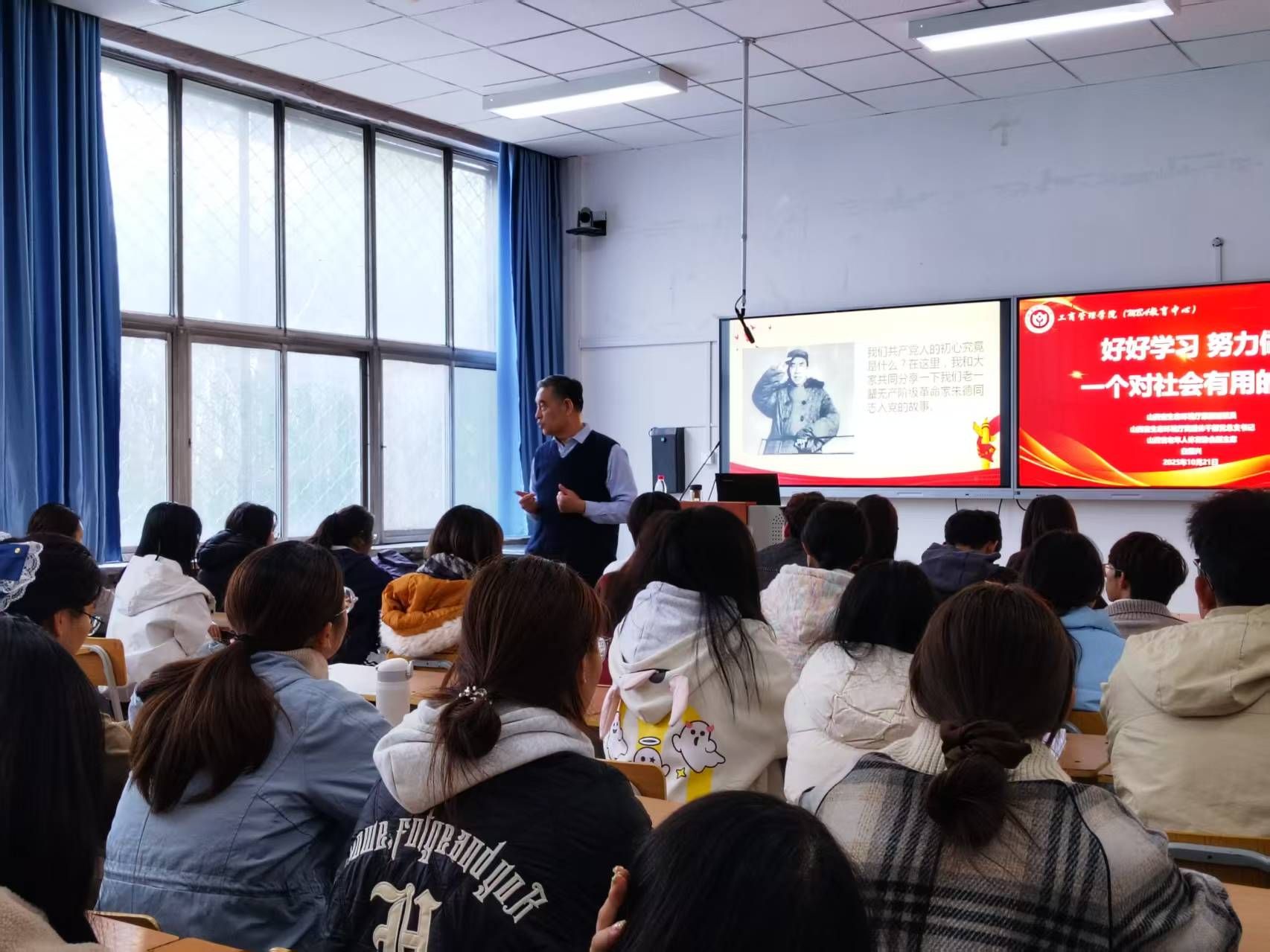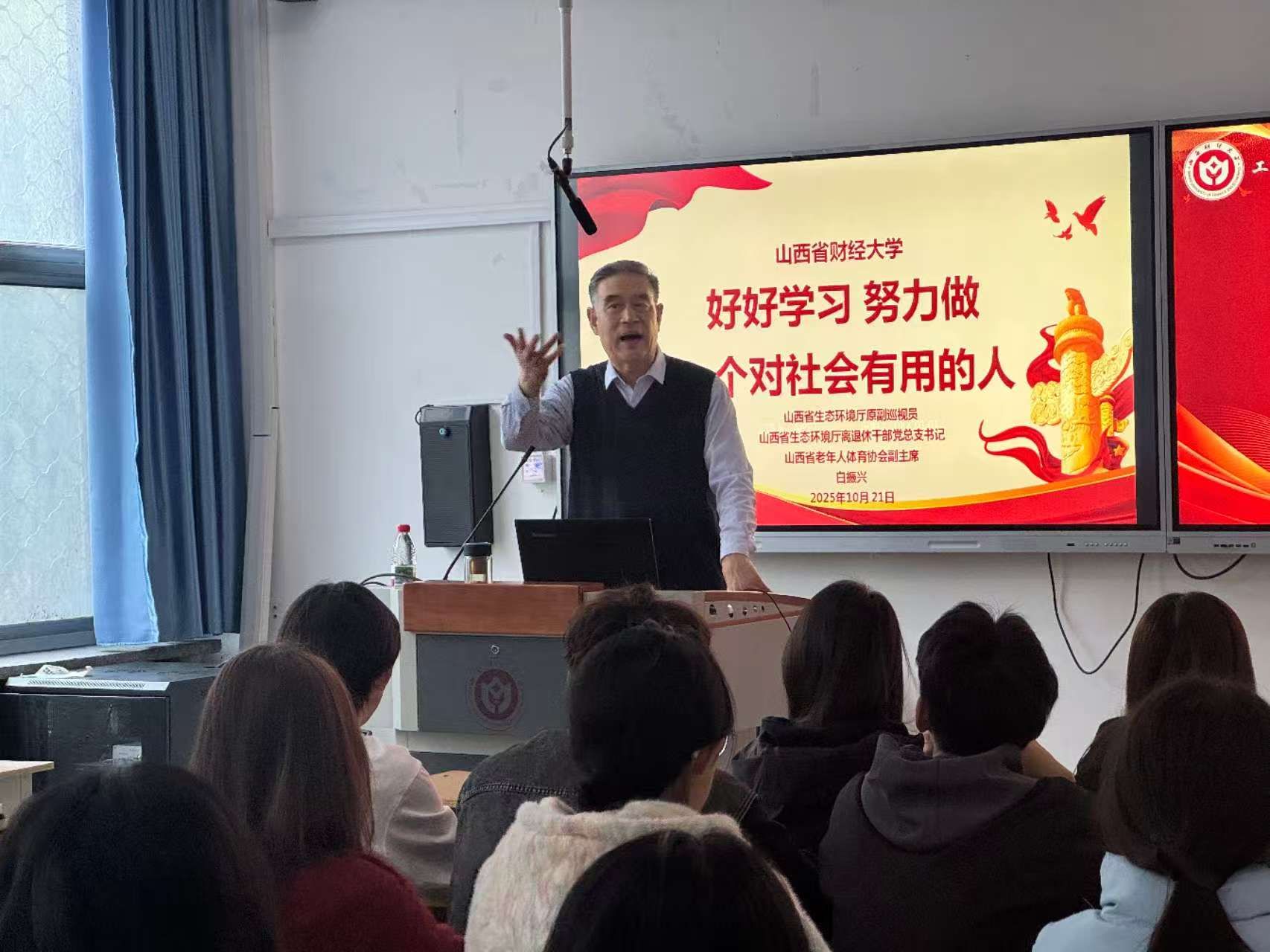 10月21日下午3:00,我院在迎泽校区北图202教室为2025级本科新生举办入学励志专题讲座。山西省生态环境厅离退休干部党总支书记、山西省老年人体育协会副主席、山西省生态环境厅原副巡视员白振兴,应邀为同学们作了《好好学习,努力做一个对社会有用的人》专题讲座。