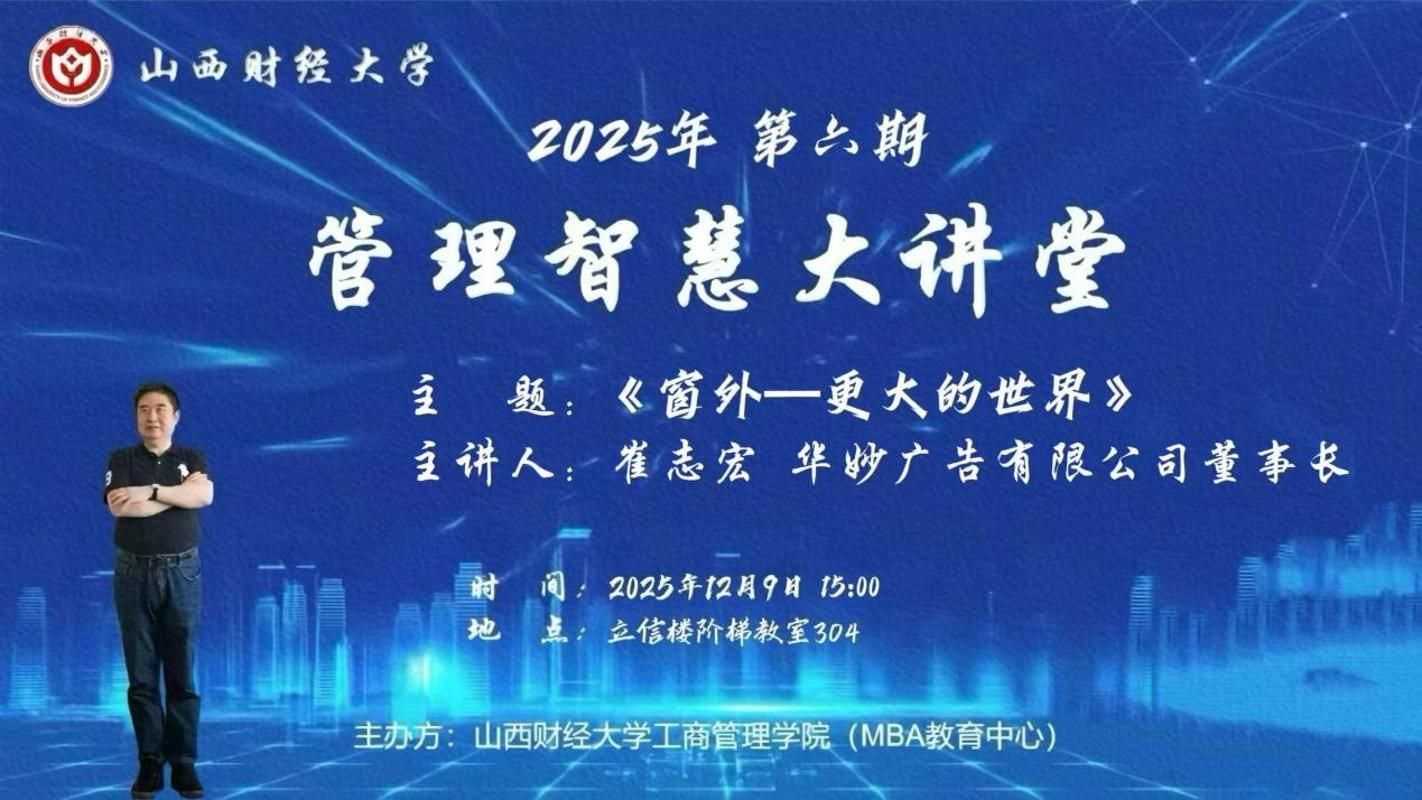 12月9日下午,太阳集团tyc151cc“管理智慧大讲堂”2025年第六期在立信楼阶梯教室304成功举办。我院优秀校友、MBA校外导师、太原市华妙广告有限公司董事长崔志宏先生应邀作题为《窗外——更大的世界》的专题讲座。学院2024级200余名同学参加了本次讲座。本次讲座由学院党委副书记周志刚主持。