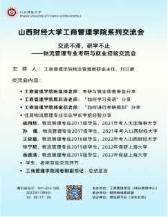 首先,陈蕴琦老师对163位物流管理专业本科生考研与就业情况调查结果进行了解读,从同学们对待考研与就业的看法、考研动因、考研准备、考验心态、考研收获以及就业观念等方面对同学们目前状态进行了全面复盘和指导,让同学们对考研心态和备考状态、就业规划有了更理性的认识。其次,周莉清老师为同学们做了“如何学习英语”的报告,周老师从英语学习方法、听说技巧和写作技巧三个方面提供了英语学习建议,建议同学们可以采用Process Method和Kaizen Method来学习英语,通过Study reduction、Study linking、Study native speech和Write what you hear来提升英语听说能力,通过写好引言、主体和结论三部分来提升英语写作能力,为同学们提高英语学习效果提供了具体的方法指导。再次,郭金花老师围绕考不考(考研还是就业)、考什么(本专业还是跨专业)、以及考哪里(本校还是外校)三个问题为同学们做了考研规划的报告,郭老师告诉同学们一定要有正确的就业观念和理性的考研心态,一定要根据自己的实际情况去做选择,一旦明确目标,就要坚持并坚信自己,朝着目标去努力,为同学们提供了一个清晰的、可操作性考研规划路线图。接着,崔冉炜、孙佩、王依楚、毕宁那以及余德清五位同学对学弟学妹们在保研、考研与备考过程中遇到的问题给出了有针对性的解答。