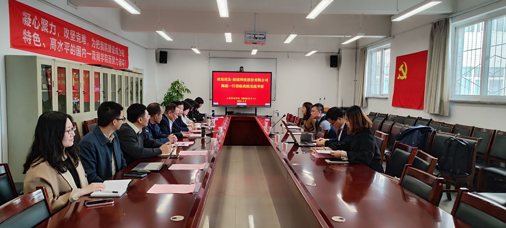 3月2日上午,用友-新道科技股份有限公司AIE解决方案事业部副总经理陶磊、新道科技股份有限公司新商科事业部业务总监陈国峰等一行4人莅临我院,就“创新数智工商”、新商科与一流专业建设等内容举行座谈会。学校国内交流合作部、实验实训中心等部门负责人,学院有关领导和各教研室负责人等参加会议。会议由卫虎林院长主持。