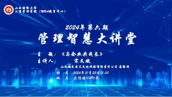10月22日下午,我院在立信楼104阶梯教室举办2024年第六期“管理智慧大讲堂”。本次活动邀请了优秀校友、太原市迎泽区第六届人大代表、山西领先云天文化传媒有限责任公司总经理宋文斌先生作了题为“与企业共成长”的专题讲座。讲座由学院党委副书记周志刚主持,年级辅导员及2023级全体本科生200余人参加。