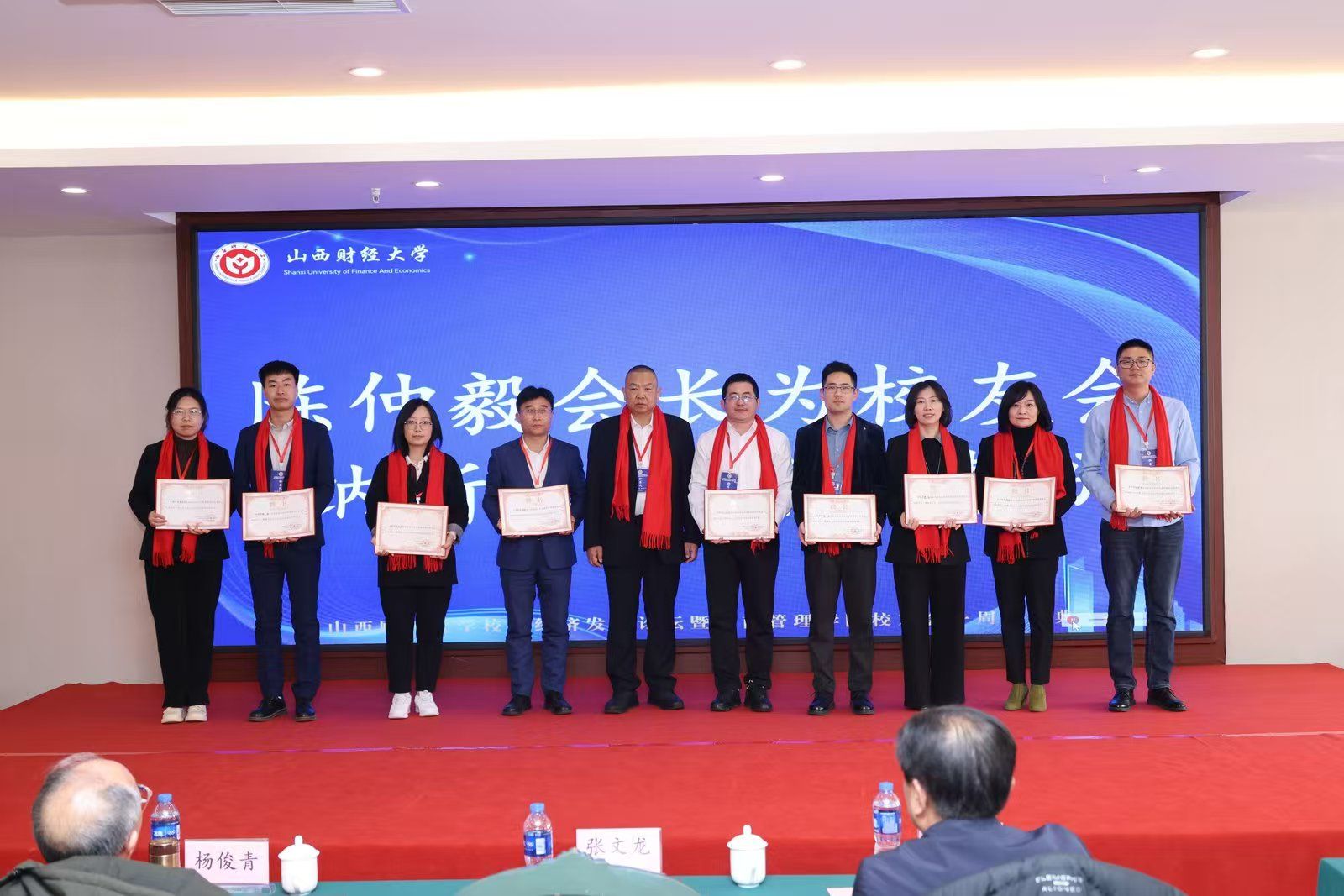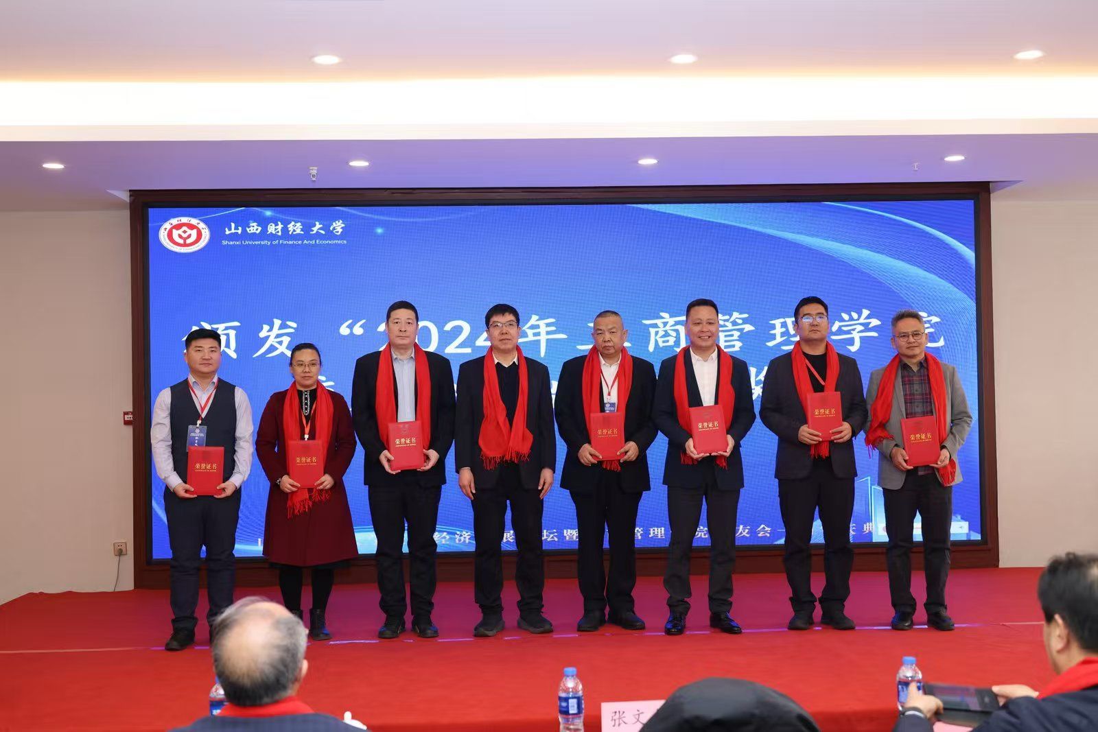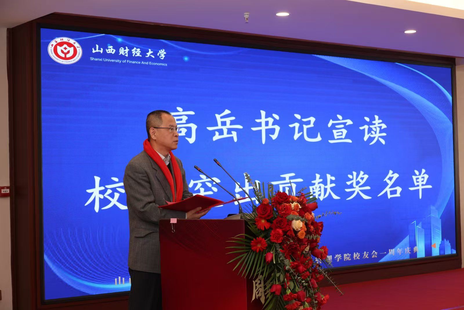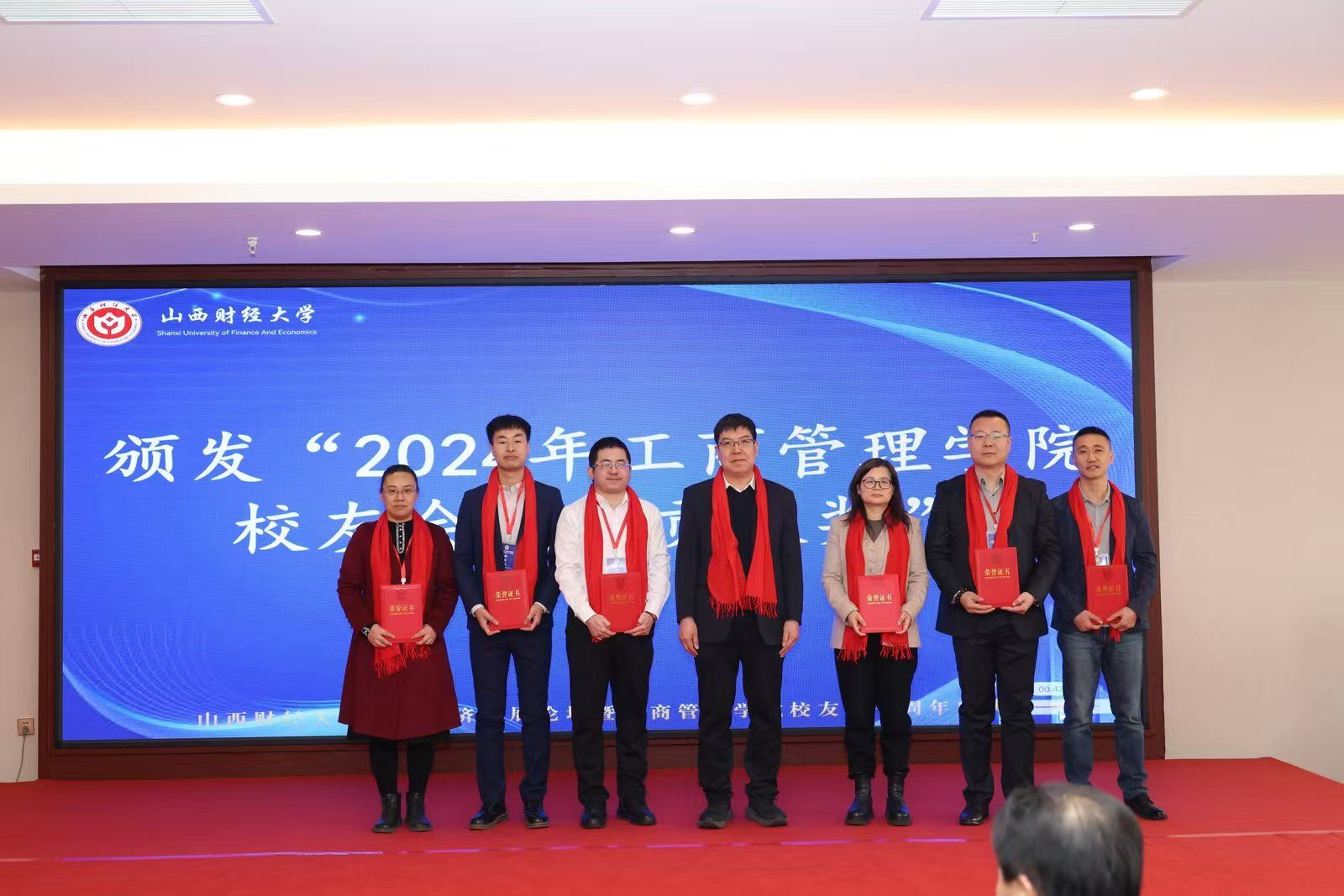 太阳集团tyc151cc党委书记高岳宣读“2024年太阳集团tyc151cc校友会突出贡献奖”名单。陈仲毅等15名校友和八七企管一班等受到到表彰,张文龙副校长为他们颁发了证书,以表彰他们在各自领域取得的优异成绩和对校友工作的突出贡献。