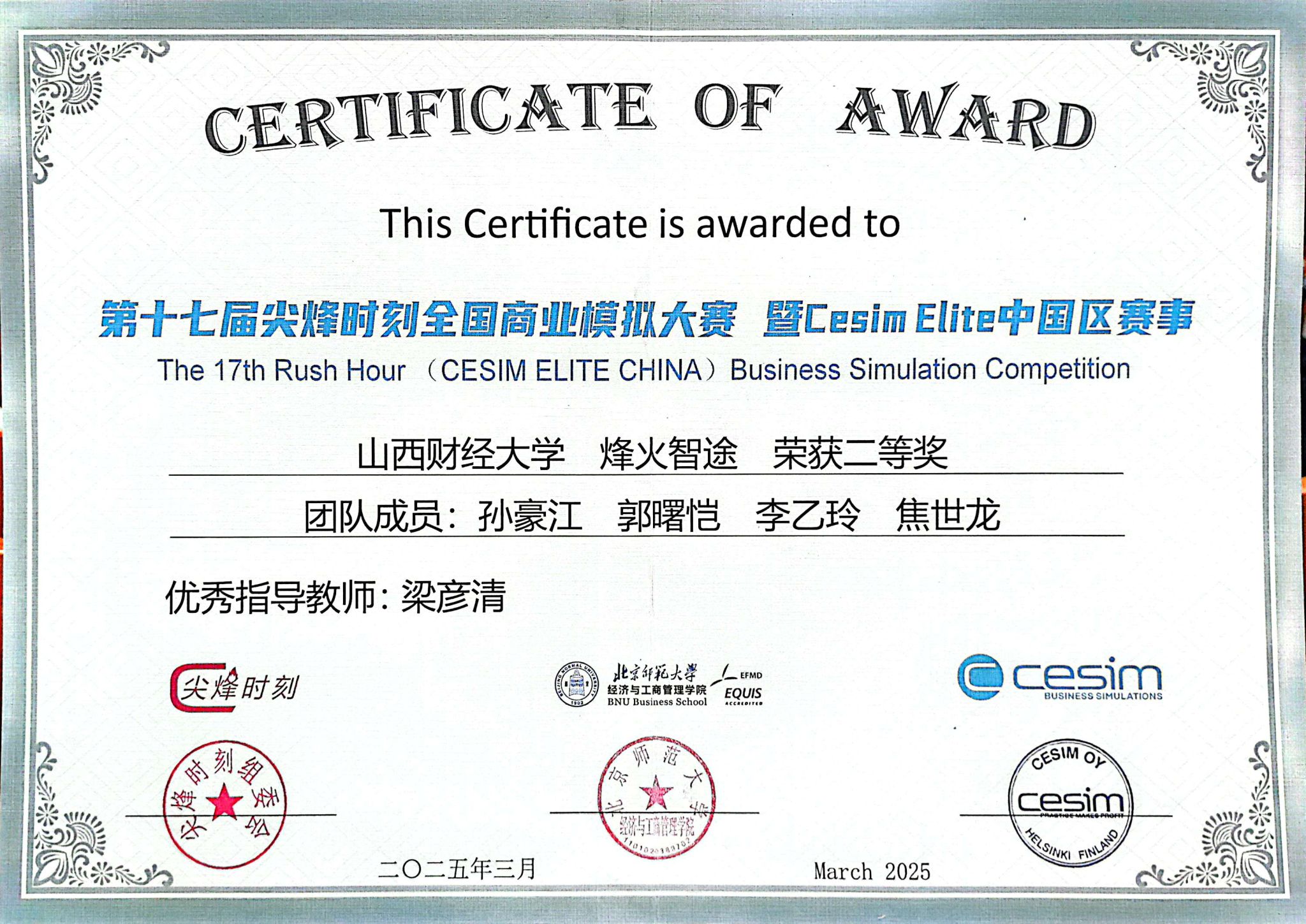 3月28日至30日,第十七届尖烽时刻全国商业模拟大赛总决赛在北京师范大学隆重举行并圆满落幕。本次大赛吸引了来自包括tyc151cc太阳在内的中国人民大学、南开大学、吉林大学等近170余所院校的超过2000支团队参与。我院高度重视、精心组织,由张莉艳、梁彦清、李昕澜老师指导的四支队伍参加了初赛并全部进入复赛,最终我院梁彦清老师指导的“烽火智途”队(团队成员:商业领导力微专业和2023级人力资源管理专业孙豪江、郭曙恺、李乙玲、焦世龙)脱颖而出晋级全国总决赛,并斩获本科组全国二等奖和尖烽海报奖,梁彦清老师荣获优秀指导教师奖。