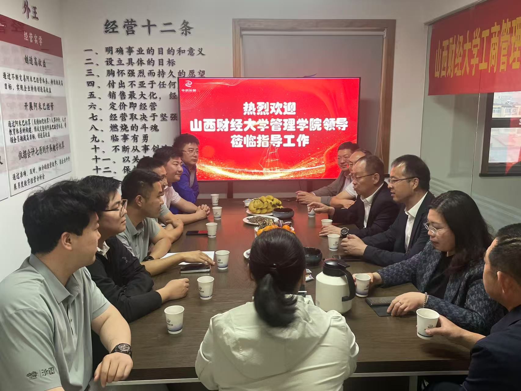 在我校2018级MBA校友、中科远航董事长徐强的陪同下,学院一行参观了公司文化墙,了解公司发展历程、项目资质及战略规划。在参访座谈会上,徐强表示希望通过此次“访企拓岗”活动使得企业与母校建立起更紧密的合作关系,实现人才培养、人才测评以及促进毕业生高质量就业的双赢局面。