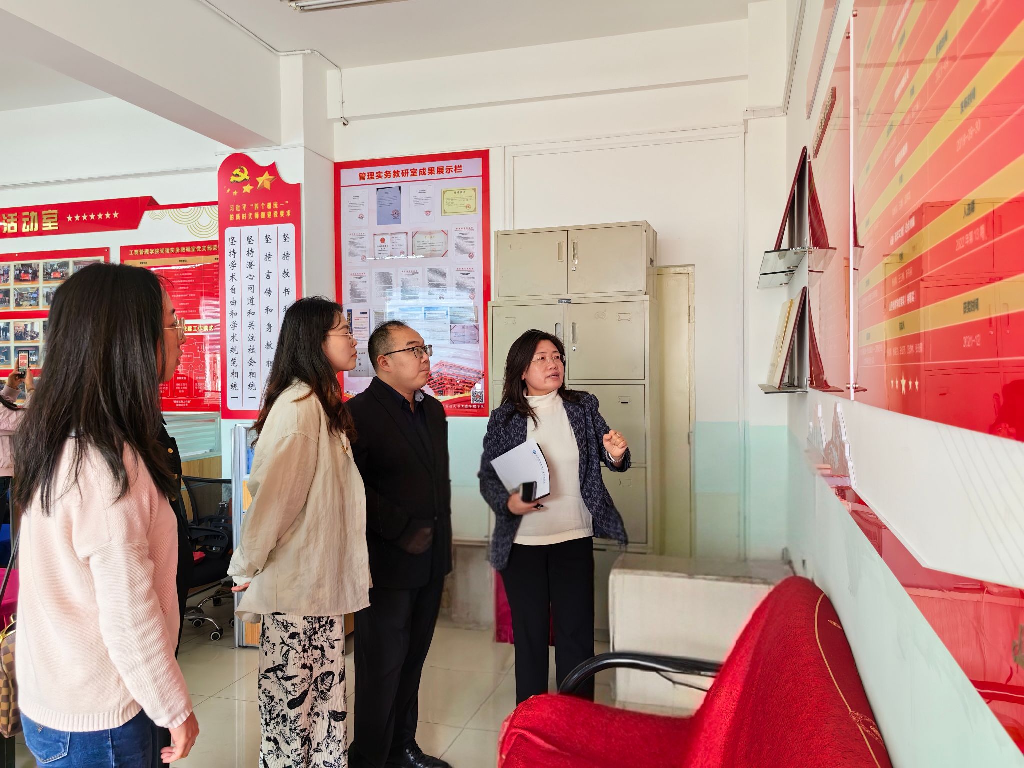会后,潘嘉亮一行在学院领导陪同下,实地察看了太阳集团tyc151cc文化墙和第三批“全国党建工作样板支部”——管理实务教研室党支部,就学院的办学理念、办学特色、党建引领等方面进行了交流探讨。