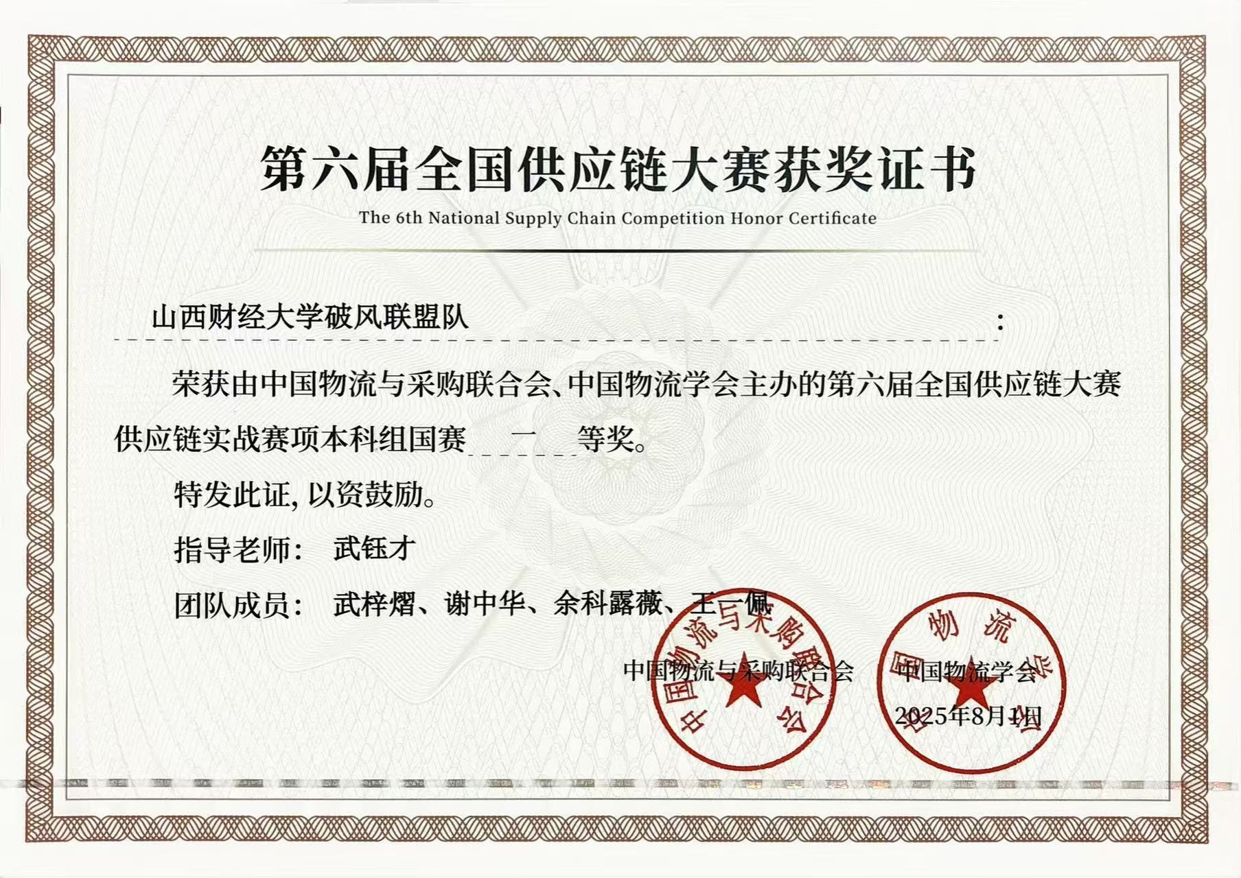 我院参赛队由2022级物流管理专业武梓熠、谢中华、余科露薇、王一佩4名本科生组成。自参赛以来,在武钰才老师的悉心指导下,队员们刻苦训练,积极备战,反复打磨战术方案,从省赛到全国总决赛,充分展现出我院学子扎实的基本功底和超强的学习能力。队员们表示,通过此次比赛,不仅有效提升了自身的物流专业素养,更是强化了团队的合作意识和决策能力。此次获奖是我院多年来坚持产教融合、以赛促教、以赛促学的有力证明,物流管理专业将继续以高水平学科竞赛为平台,将课堂与赛场紧密结合,通过竞赛促进我院国家“双一流”专业建设,再创佳绩。(太阳集团tyc151cc 武钰才供稿)