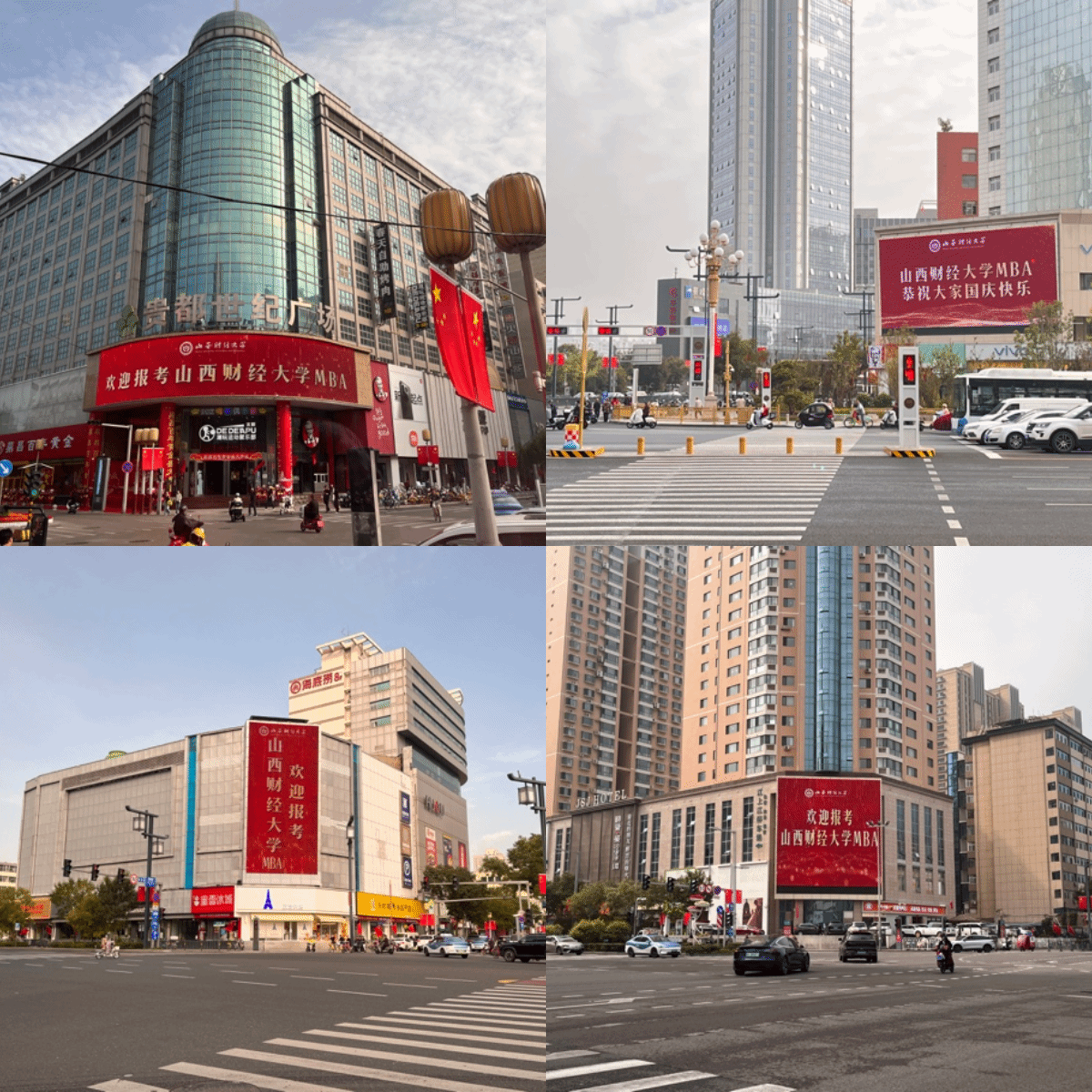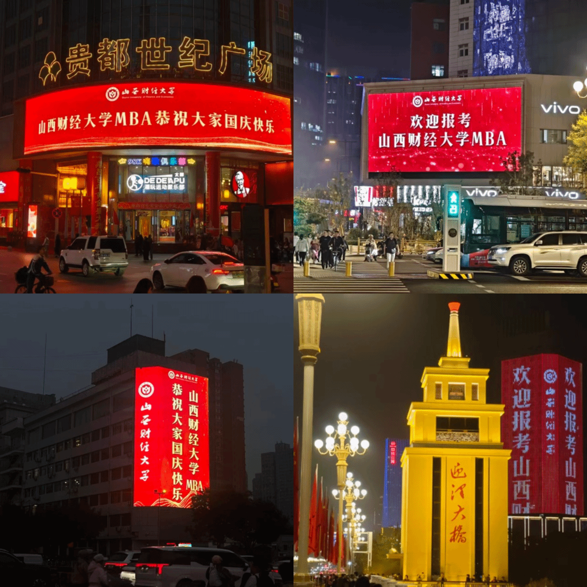 9月28日,太原市三晋第一屏——迎泽大街大南门LED大屏、太原第一商业街——柳巷贵都LED大屏、城南第一屏——亲贤街王府井百货对面LED大屏、开化寺商圈第一屏——开化寺屏、平阳路气象屏等多个省城核心地标户外大屏同时点亮,滚动播出着“tyc151cc太阳MBA恭祝大家国庆快乐”、“欢迎报考tyc151cc太阳MBA”等温馨祝福与诚挚问候。在国庆佳节即将来临之际,鲜艳的“财大红”再次点亮龙城夜空,向社会各界送上诚挚的节日问候与祝福。