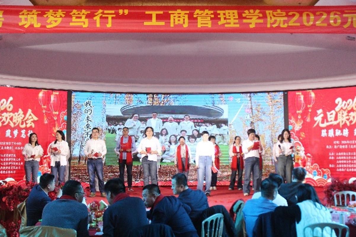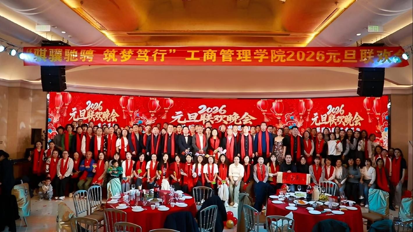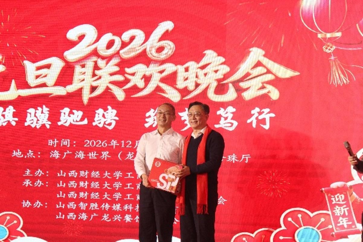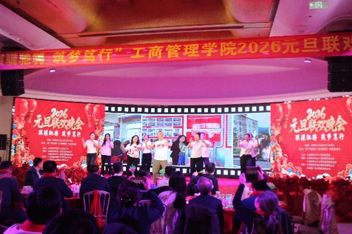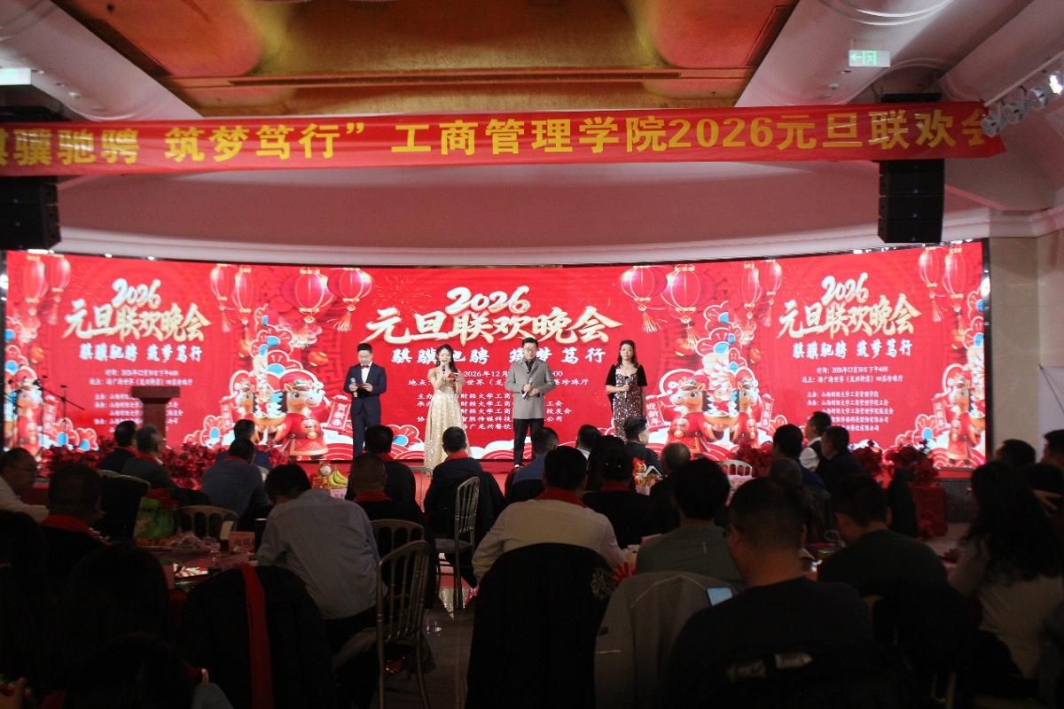 12月30日下午,海广海世界(龙兴街店)四层珍珠厅张灯结彩、共庆新年。我院全体教职工与校友代表、嘉宾欢聚一堂,隆重举办了以“骐骥驰骋,筑梦笃行”为主题的2026年元旦联欢会。原tyc151cc太阳党委常委、副校长杨俊青,tyc151cc太阳工会主席董兆军,tyc151cc太阳就业创业中心主任史成安出席活动,并为师生们带来了亲切问候和新年祝福。