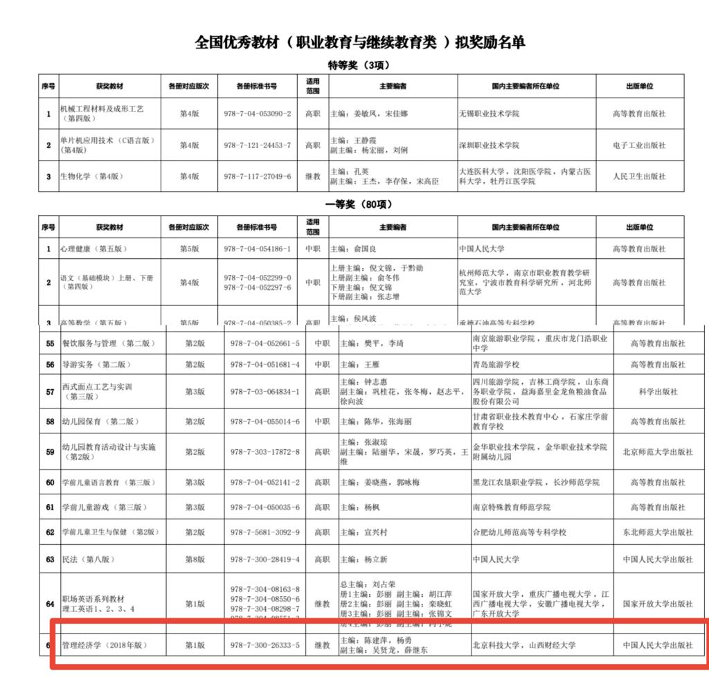 薛继东老师担任副主编的《管理经济学》(中国人民大学出版社,2018)教材,获首届全国教材建设奖·全国优秀教材(职业教育与继续教育类)拟奖励名单一等奖公示。