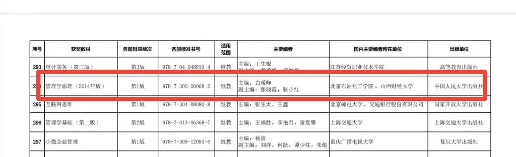张晓霞老师担任副主编的《管理学原理》(中国人民大学出版社,2014)教材,获首届全国教材建设奖·全国优秀教材(职业教育与继续教育类)拟奖励名单二等奖公示。