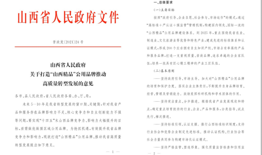 近日,山西省政府下发《关于打造“山西精品”公用品牌推动高质量转型发展的意见》(晋政发〔2021〕24号),按照“政府引导、企业自愿、社会参与、市场运作”的模式,通过“高标准+严认证+强监管”管理机制,构建国内领先、国际一流的“山西精品”公用品牌建设体系。