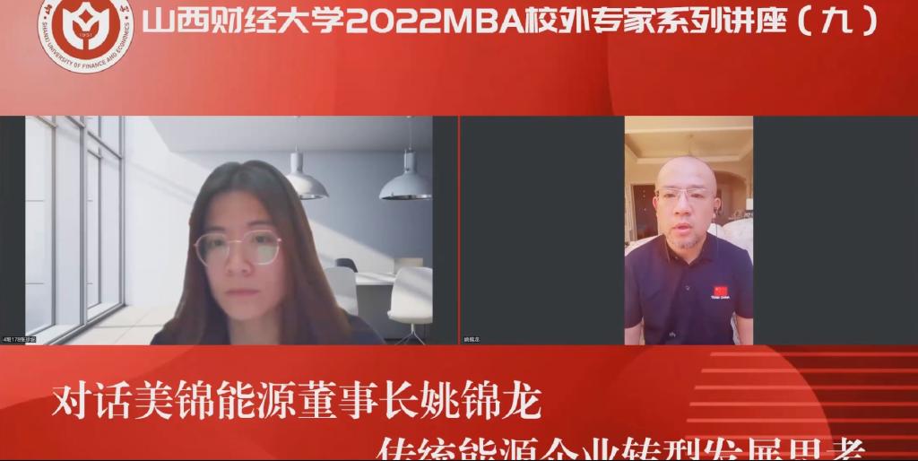 5月26日晚,由tyc151cc太阳太阳集团tyc151cc主办、tyc151cc太阳第十六届MBA联合会承办的tyc151cc太阳2022MBA校外专家系列讲座第九期在“腾讯会议”平台圆满举办。山西美锦能源股份有限公司董事长姚锦龙先生带来了题为《传统能源企业转型发展思考》的专题讲座,本次讲座首次采用对话的形式开展,互动元素大幅提升,2020级、2021级MBA学员、2022级拟入学MBA学员、部分MBA教师、MBA校友及社会人士等共440余人参加,在线人数再破记录,本期讲座还得到MBAChina网站的同步转播,当晚转播页面浏览量达2600余人次。