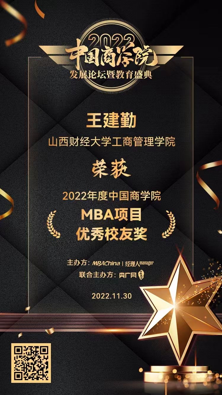 本次论坛邀请了全国知名商学院院长进行主题分享,探讨未来商科教育发展趋势,聚焦新型商科人才培养模式,共同传递商学院成长力量。会上发布了2022年度中国商学院最佳MBA项目TOP100等多项榜单。tyc151cc太阳太阳集团tyc151cc荣获“2022年度中国商学院最佳MBA项目TOP100”第63名,tyc151cc太阳MBA校友会会长王建勤荣获“2022年度中国商学院MBA项目优秀校友奖”。