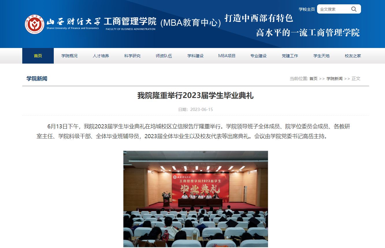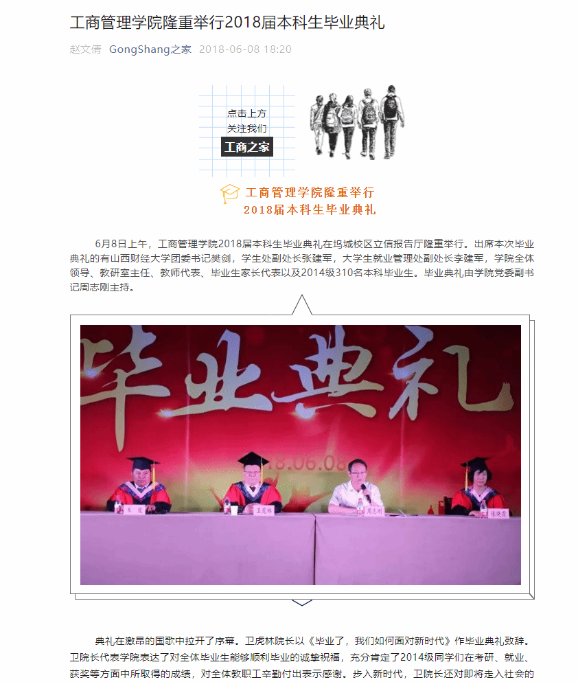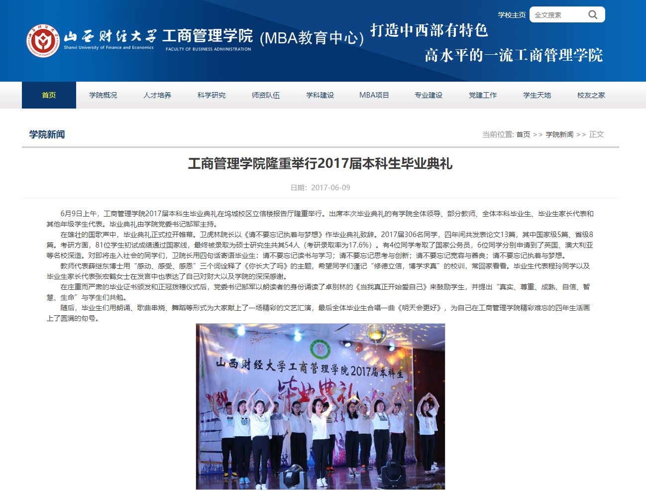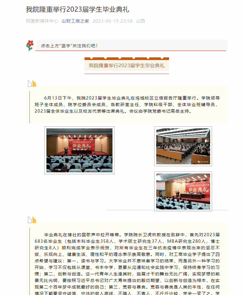 会上,本科毕业生代表尉悦同学讲述了不平凡的平凡故事,学硕研究生代表谢佳同学表达了对母校的怀念和感恩,MBA毕业生代表郭素丽同学用诙谐幽默的语言讲述了他们的山财情。