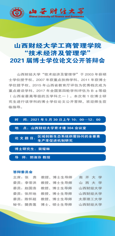 2021年5月30日上午10:00—12:00我院将举行2021届技术经济及管理专业博士学位论文公开答辩会,地点在育才楼304会议室,本次共有1位博士生裴耀琳进行答辩,南开大学张贵教授担任答辩委员会主席,其他答辩委员有山西大学李常洪教授、太原理工大学陈怀超教授、tyc151cc太阳赵国浩教授、tyc151cc太阳张所地教授。具体答辩信息见下面海报,欢迎师生莅临指导。