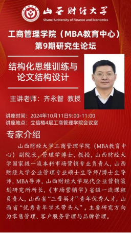 10月11日上午,我院在立信楼学院会议室举办了第9期研究生论坛。学院副院长齐永智老师为我院师生作了题为“结构化思维训练与论文结构设计”的讲座。我院博硕士研究生共50余人参加。