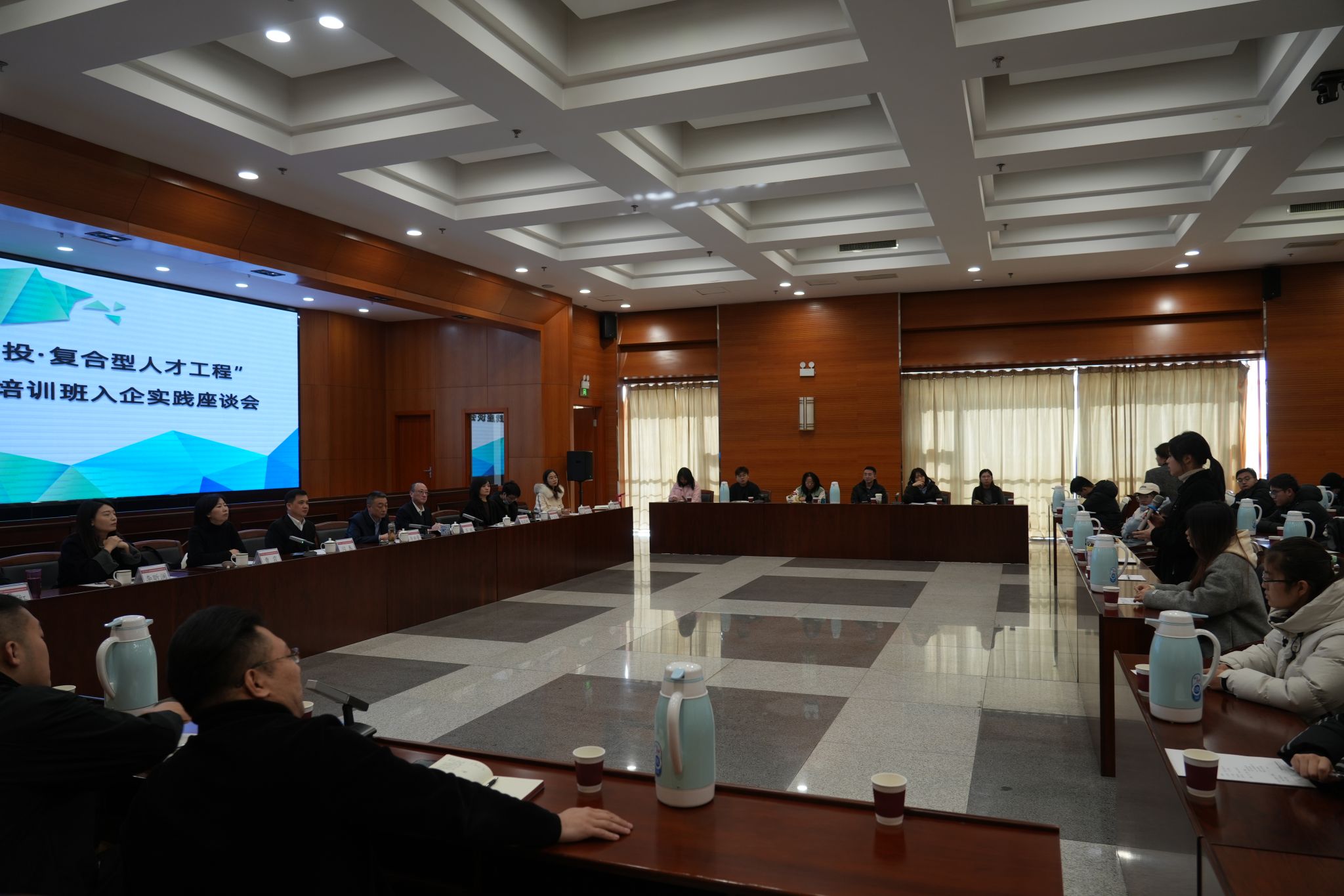 11月30日上午,在我校科研部副部长闫春、管理原理教研室负责人张莉艳的带领下,商业领导力微专业师生一行43人赴山西省经济建设投资集团有限公司(以下简称“经建投”)开展入企实践活动。本次入企实践得到了经建投的热情欢迎和大力支持,经建投党委委员、副总经理李洪晋主持座谈会,经建投副总经理苏斌出席并发表讲话,经建投组织人事部部长张晓红及选修微专业课程的10名经建投学员全程陪同。
