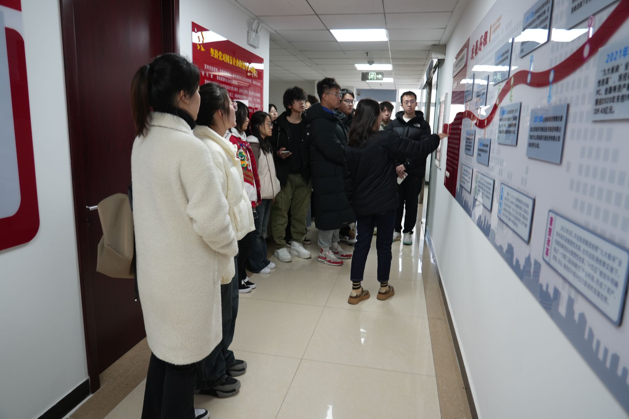 参观环节中,经建投讲解员带领我院师生分三批对集团各部门、文化墙、产品样品陈列进行了参观、介绍,并观看了企业宣传片。同学们对于经建投集团的发展历程、四大业务板块、业务的发展与转型、党建工作、工会荣誉以及我院与经建投校企合作的历史有了较为直观的认识。