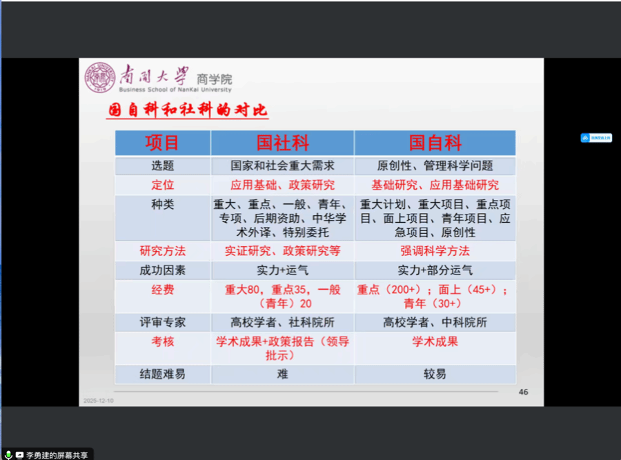 李勇建教授以“国社科特点与注意事项—国自科特点与注意事项—两类项目选择策略”为清晰脉络,展开系统深入的分享。在国家社科基金项目板块,他重点聚焦国家政策与选题方向、项目类别与研究导向,详谈关于国家课题选题与框架设计的几点思考,强调经济与管理学科项目申报理应具有现实性、针对性和较高的决策参考价值。此外,他结合通讯评审的核心指标,拆解了课题论证活页的撰写要点:选题需紧扣国家政策文件、自身研究基础与学科前沿,论证要突出选题依据的现实意义、研究内容的逻辑层次、创新之处的鲜明特色,同时重点阐述代表性研究成果,明确课题的理论与方法创新。