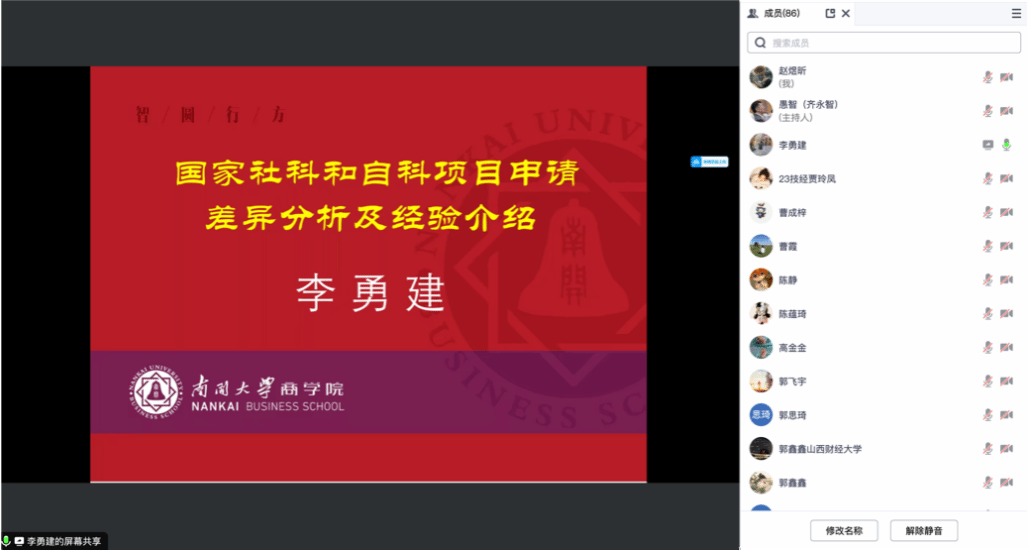 12月10日19:00,我院在腾讯会议举办第51期博士论坛。南开大学二级教授、博士生导师,人文社会科学研究部常务副部长李勇建教授应邀为我院做“国家社科和自科项目申请差异分析及经验介绍”专题讲座。论坛由太阳集团tyc151cc副院长齐永智教授主持,学院教师及硕博研究生共80余人参会。