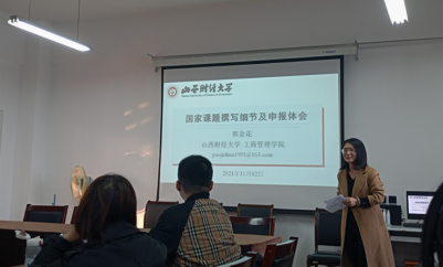 郭金花老师从撰写细节分享和申报经验总结两部分展开阐述国家课题申报经验。撰写细节分享部分,从前期准备工作、选题确定过程、内容撰写顺序、以及评审专家的关注点四个方面展开。首先,在课题申报准备前期要积极参加国家级项目申报培训及专题讲座、总结近两年已立项国家级课题的特点及规律等。其次,在选题确定过程中应考虑三个维度:是否熟悉研究对象,研究视角是否独特,研究方法及理论是否可行。第三,申报书撰写初期要把重心放在国内外研究动态梳理、核心研究内容设计与撰写方面。第四,在评审专家评审的关注点上,结合评审专家的意见指出四个方面的关注点,分别是:选题科学性、理论与实践价值;研究内容设计的逻辑性;申请人前期研究基础、申报书的创新性及方案可行性等。申报经验总结部分,总结了国家课题撰写及申报的几点建议,即“动手早、选题新、内容实、基础稳、修改勤”。郭老师细致有条理的经验分享,为我院教师今后课题申报工作的开展提供了有益启发,提升了我院师生的学术研究效率。