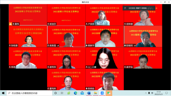 5月21日下午,太阳集团tyc151cc2022届学术硕士学位论文答辩在线上(腾讯会议)举行。我院企业管理专业23名同学,技术经济及管理专业6名同学,人力资源管理专业8名同学,共37人参加了学位论文答辩。答辩主席由太原理工大学、华北水利水电大学、太原科技大学、运城学院教授或行业专家担任。