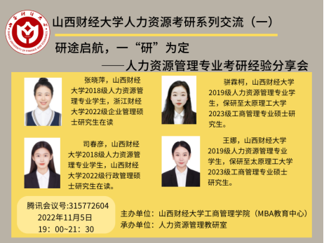 为切实提升本科生考研率,帮助学生做好考研准备,11月5日晚上,人力资源管理专业通过腾讯会议线上举办了“研途启航,一研为定”考研经验分享会,会上邀请了张晓萍、司春彦、骈霖柯、王娜四位同学进行考研和保研经验分享,人力资源管理专业2020级、2021级、2022级同学等90余人参加,会议由人力资源管理教研室主任闫向连老师主持。