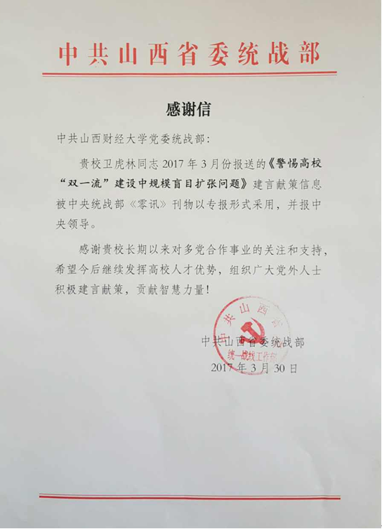 近日,我校无党派人士、太阳集团tyc151cc院长卫虎林教授所撰写的《警惕高校“双一流”建设中规模盲目扩张问题》的有关建议,被中共中央统战部《零讯》以专报形式采用。这是继2016年我校九三学社主委张慧霞教授的建议被《零讯》采用以来第二次入选该专报。