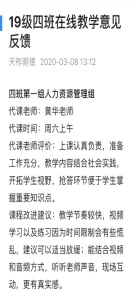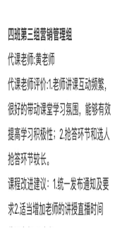 根据同学们的课后反馈意见,我觉得在以后的教学中应注意几点:第一,适当把教学节奏放慢,课前害怕学生没有人监督会懈怠,课程安排得过于饱满,测验时间较短,部分同学跟不上节奏,以后适当精简内容;第二,由于设备和技术所限,和学生的直接语言交流较少,以后适当增加音频内容;第三,抢答环节涉及本次课程主要知识点,是对学生观看视频自主学习效果的考察,也是帮助学生提炼知识的过程,内容不能少,但速度要放快。