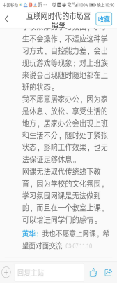 3、讨论学习应用知识点。结合目前疫情提供了关于远程办公、网络教育等问题的案例材料,让学生结合营销环境的变化和自己的实际情况提出看法,因为讨论题对于学生来说都是参与者和关注者,同时大家也和我一样也为此矛盾和困惑,55名同学,59份回复,大家讨论积极热烈。我也进行了评价和追问,引发学生深入思考营销理论在实践中的运用。