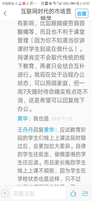 课堂采取观看教学视频、学习PPT、阅读相关资料、课堂互动、讨论、随堂测验、课后作业多种方式相结合,整体课堂教学比较顺利。学生抢答问题相当积极,基本上全班五分之四的同学参与了抢答,因为时间有限,还有部分同学没有机会回答。在讨论过程中,由于背景材料是疫情下远程办公、远程教育问题,与每一位学生息息相关,他们都是参与者,学生发言相当踊跃,部分同学多次参与,不断回复,我必须快速浏览学生观点并做出响应,对高质量发言通过点赞给学生加分。对于一些学生的疑惑,均给予了及时回复,并通过追问加深学生的理解。同时还要对部分好观点进行手机截屏,发微信群供大家学习。通过讨论,帮助同学们提高了运用营销理论分析解决实际问题的能力。最后十分钟对讨论互动过程进行了归类总结,对本次课程需要掌握的知识点及其应用做了再次强调。