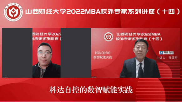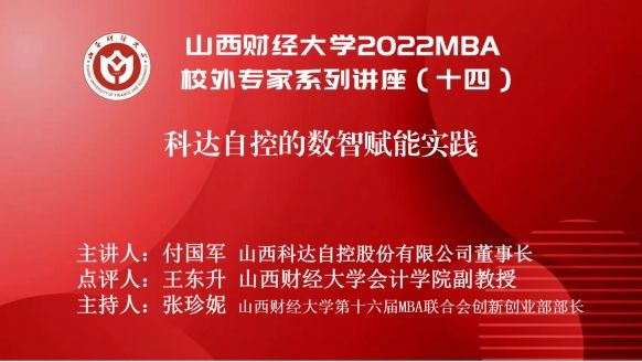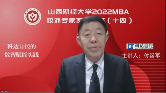 10月27日晚,由tyc151cc太阳太阳集团tyc151cc主办、tyc151cc太阳第十六届MBA联合会承办的tyc151cc太阳2022MBA校外专家系列讲座第十四期在“腾讯会议”平台圆满举办。山西科达自控股份有限公司董事长付国军带来了题为《科达自控的数智赋能实践》的专题讲座,2022级MBA学员、部分MBA教师、MBA校友、科达自控管理团队等300余人参加,本期讲座还得到MBAChina网站的同步转播。