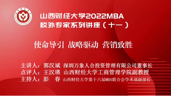 6月23日晚,由tyc151cc太阳太阳集团tyc151cc主办、tyc151cc太阳第十六届MBA联合会承办的tyc151cc太阳2022MBA校外专家系列讲座第十一期在“腾讯会议”平台圆满举办。深圳万象人合投资管理有限公司创始人郭汉斌先生带来了题为《使命导引 战略驱动 营销致胜》的专题讲座,2020级、2021级MBA学员、2022级拟入学MBA学员、部分MBA教师、MBA校友等近300人参加,本期讲座还得到MBAChina网站的同步转播。