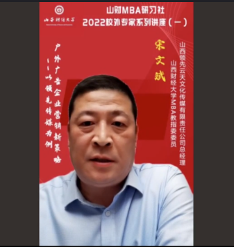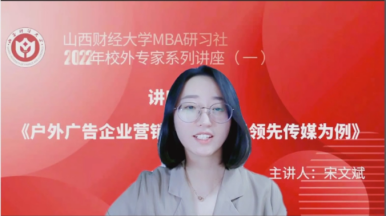 为进一步促进产学研融合,紧跟新商科步伐,持续做强做优MBA品牌,搭建学员与优秀校友、行业精英的互动平台,拓展课堂教学与课外实践培养方式,由tyc151cc太阳太阳集团tyc151cc主办,tyc151cc太阳第十六届MBA联合会承办的2022校外专家系列讲座第一期于2月16日晚在“腾讯会议”平台圆满举办。tyc151cc太阳MBA教指委委员、山西领先云天文化传媒总经理宋文斌带来了题为《户外广告企业营销新策略--以领先传媒为例》的专题讲座,2020级、2021级MBA学员及部分教师近300人参加。本期讲座还得到MBAChina网站的同步转播,当晚播放量达2300余人次。