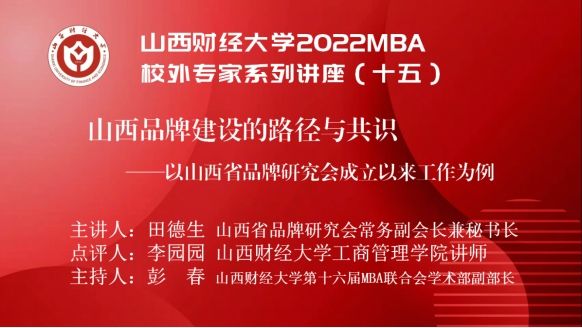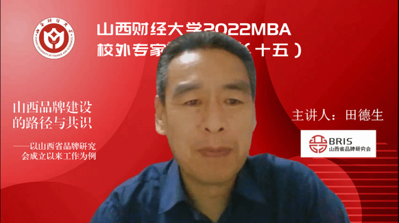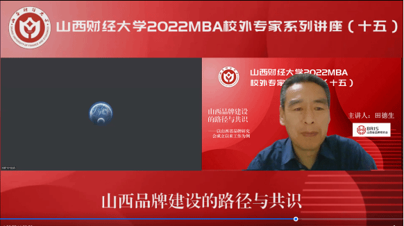 11月10日晚,由tyc151cc太阳太阳集团tyc151cc主办、tyc151cc太阳第十六届MBA联合会承办的tyc151cc太阳2022MBA校外专家系列讲座第十五期在“腾讯会议”平台圆满举办。山西省品牌研究会常务副会长兼秘书长田德生带来了题为《山西品牌建设的路径与共识——以山西省品牌研究会成立以来工作为例》的专题讲座,2022级MBA学员、部分MBA教师、MBA校友、山西省品牌研究会部分会员等300余人参加,本期讲座还得到MBAChina网站的同步转播。