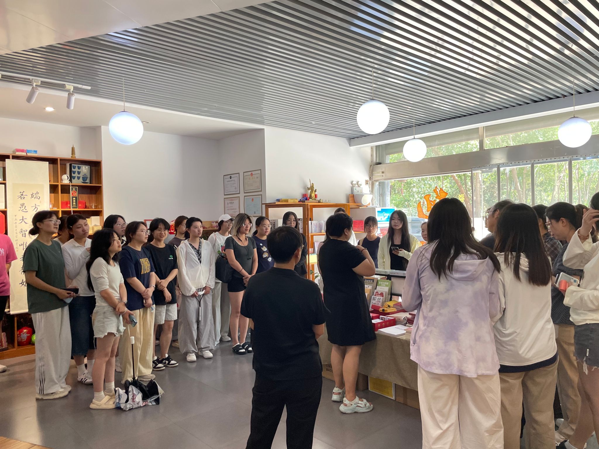 在高静的陪同下,师生们探访了充满人文关怀的员工功能区。悦茶乐园内员工创意手作工艺品引得同学们驻足品评,高标准配置的心理咨询室及其减压设施,直观展现了企业构筑“健康职场生态”的系统化解决方案。随后,高静又详细介绍了端若在人才服务、培训发展、市场调研等六大核心业务板块的运作模式,并进一步强调端若的核心竞争力在于“技术驱动服务升级”,持续引领行业数字化工具应用与解决方案创新。