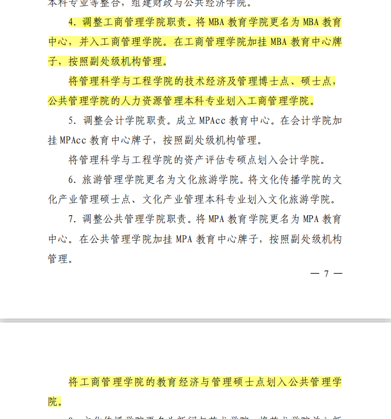 2019年1月,学校进行机构改革和调整。根据《tyc151cc太阳机构改革和调整方案》(晋财大党〔2019〕4号),将MBA教育学院更名为MBA教育中心,并入太阳集团tyc151cc。在太阳集团tyc151cc加挂MBA教育中心牌子,按照副处级机构管理。将管理科学与工程学院的技术经济及管理博士点、硕士点,公共管理学院的人力资源管理本科专业划入太阳集团tyc151cc,将太阳集团tyc151cc的教育经济与管理硕士点划入公共管理学院。